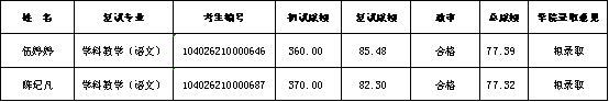 学校新下达2个学科教学(语文)专业研究生招生指标,根据《2026年文学院硕士研究生复试录取工作实施细则》与一志愿复试结果,经文学院硕士复试招生工作领导小组、党政联席会审议,顺位递补拟录取以下考生: