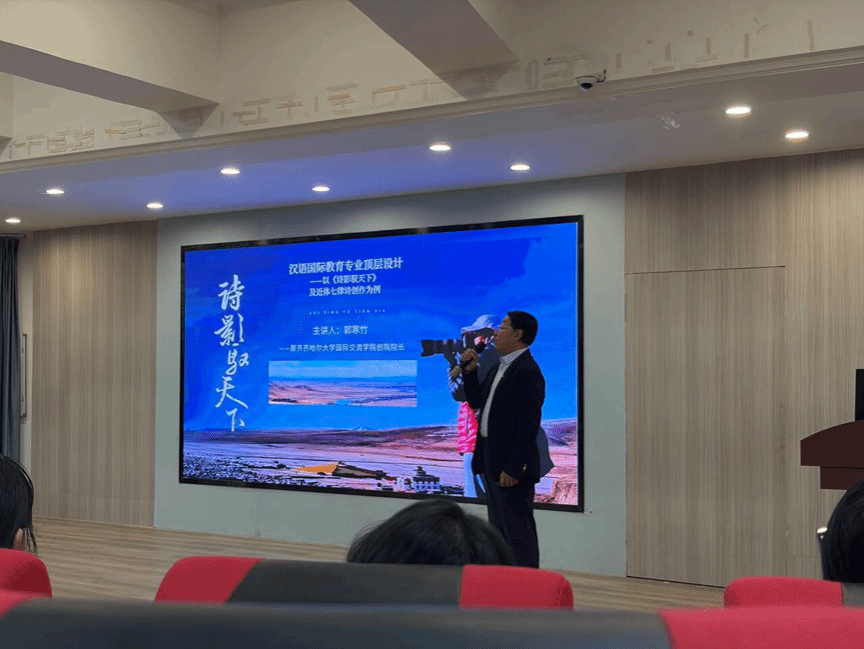 特邀原齐齐哈尔大学国际交流学院创院院长郭寒竹,开展了主题为“汉语国际教育专业顶层设计——以《诗影驭天下》及近体七律诗创作为例”的专题讲座。本次活动由国际中文教育学科负责人洪水英副教授主持开场,周军副院长出席并作点评,全体汉语国际教育专业学生到场聆听。讲座伊始,郭寒竹高屋建瓴地指出,汉语国际教育专业的核心目标在于培养“阅古览今、学贯中西、兼容并蓄”的国际汉语教师。他强调,该专业的知识结构横跨语言、文化及跨学科等多个领域,学生在四年的大学时光中必须保持求知的“饥饿感”与紧迫感深耕不辍,方能精准把握汉语的独特魅力与跨文化传播的要义。他特别提出,英语与古典文学是该专业建设的两大核心支点。他分享了齐齐哈尔大学在英语能力培养方面的成功经验:通过开设专项课程、组织英语角和朗诵大赛等多元活动,曾创下四六级通过率比肩顶尖高校的佳绩,更是在孔子学院大会上荣获由国务院副总理亲自颁发的“汉语国际先进志愿者”荣誉称号,充分彰显了扎实的专业育人实力。随后,他通过生动的翻译实例,向同学们直观展示了双语能力与古典文学底蕴相结合的专业魅力。他将英文短句“I love three things in this world. The sun, the moon and you. Sun for morning, moon for night, and you forever”优美地译为“吾爱有三,日月与卿。日为朝,月为暮,卿为朝朝暮暮”;将“Nobody is nobody”巧译为“芸芸众生,各有不凡”。这些精妙的翻译让在场学子深刻体会到,古典文学能为语言表达赋予极大的张力与意境。