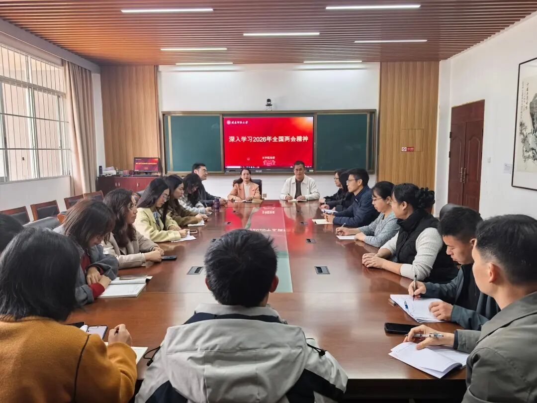 会议认真传达学习全国两会精神,紧密结合学院实际,对 2026 年春季学期重点工作进行具体部署与目标展望,统筹推进教学科研、人才培养、管理服务等各项任务,确保新学期工作安全、平稳、有序开展。